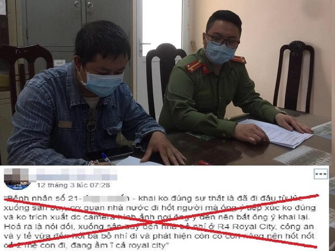 Trước đó, qua quá trình rà soát trên không gian mạng, Công an huyện Thạch Thất phối hợp với Phòng An ninh mạng và phòng, chống tội phạm sử dụng công nghệ cao Công an TP Hà Nội phát hiện một tài khoản facebook đăng tải thông tin thất thiệt về bệnh nhân thứ 21 nhiễm Covid-19. Bài viết này có nội dung về việc bệnh nhân thứ 21 khai báo y tế không trung thực, có bồ nhí... Những thông tin này nhanh chóng được nhiều người "like" và bình luận, chia sẻ.