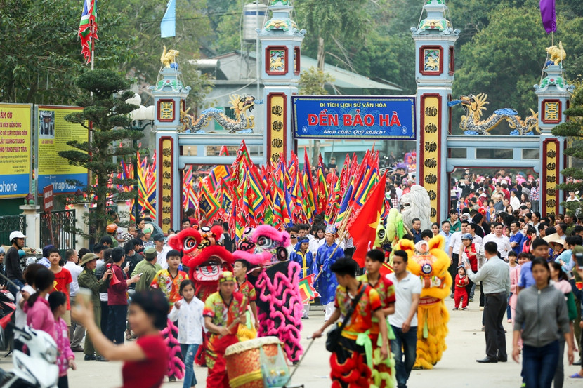 Trước đó, lễ hội Đền Cô đã được khai màn với nghi thức truyền thống là kiệu rước Cô sang đón ông Hoàng Bảy từ đền Bảo Hà sang đền Cô. Sau khi hành lễ xong, người dân lại kiệu rước Cô đưa Ông trở về Đền Bảo Hà. Tương truyền, ngày lễ chính Đền Bảo Hà 17-7 (Âm lịch) là ngày giỗ Ông Hoàng Bảy, vì là mối quan hệ cha con nên nhân dân đã kiệu rước Cô sang Đền Ông Bảy từ chiều hôm trước và sau khi hành lễ giỗ Ông xong nhân dân rước Cô trở lại Đền.