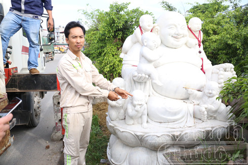Trần Thoát Hoan và tang vật là pho tượng Phật Di lặc bằng đá trắng nguyên khối trị giá 120 triệu đồng