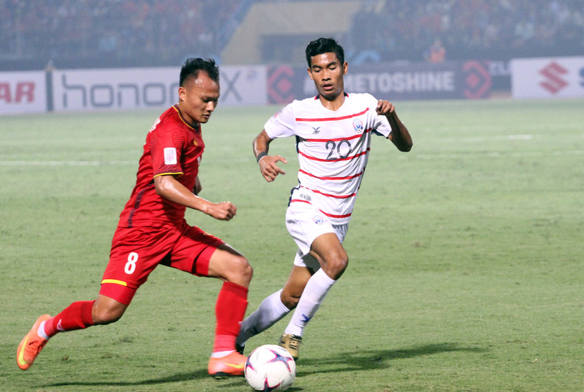 Trọng Hoàng (trái) trong trận thắng của tuyển Việt Nam trước Campuchia