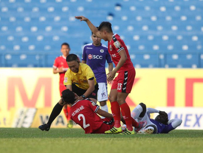 Ngay ở phút thứ 3 trận đấu ở vòng 8 V-League 2019 giữa Bình Dương và Hà Nội, Nguyễn Hoàng Thiện Đức đã va chạm rất mạnh với Pape Omar của đội khách trong một pha không chiến.