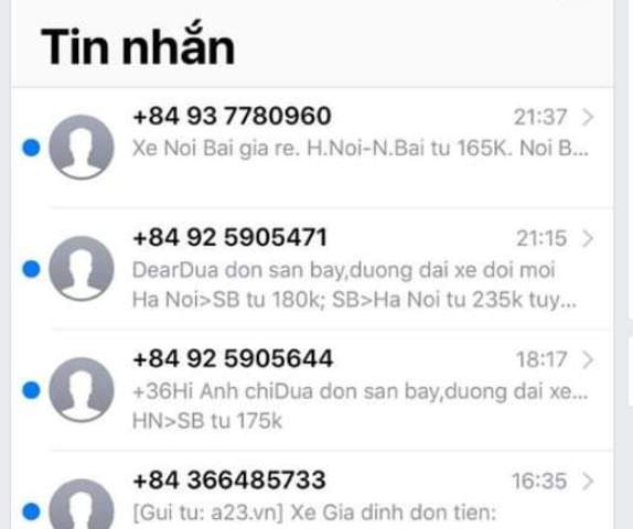 Đặt xong vé máy bay đi từ Hà Nội-TP.HCM, 2 ngày trước chuyến bay, chị Đặng Hoàng Thu Trang ở Khuất Duy Tiến, Thanh Xuân, Hà Nội liên tiếp nhận được tin nhắn, mời chào, giới thiệu dịch vụ xe đưa đón sân bay, dù chị không có nhu cầu.