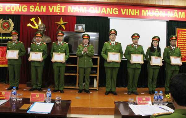 Đại tá Nguyễn Trọng Chí, Phó Tư lệnh Bộ tư lệnh Cảnh sát cơ động tặng Bằng khen của Bộ Công an cho các CBCS có thành tích xuất sắc của Trung đoàn CSCĐ - CATP Hà Nội