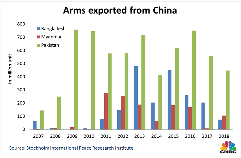 Cụ thể, kể từ năm 2007, các nước nhập khẩu vũ khí hàng đầu từ Trung Quốc theo tổng số đơn vị là Pakistan (6,57 tỷ đơn vị), Bangladesh (1,99 tỷ đơn vị) và Myanmar (1,28 tỷ đơn vị), theo SIPRI. Cả ba quốc gia này là một phần của chiến lược phát triển toàn cầu của Trung Quốc - Sáng kiến Vành đai và Con đường.