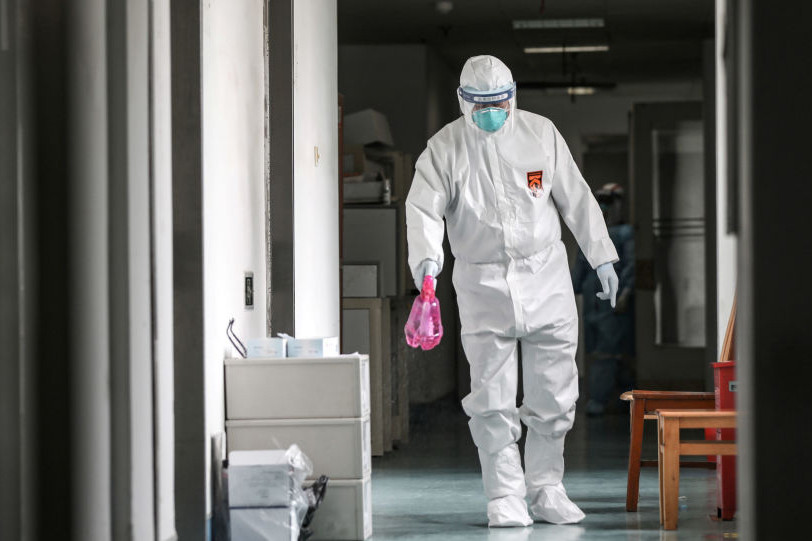 Nhân viên y tế phun thuốc khử trùng tại 1 bệnh viện ở Vũ Hán