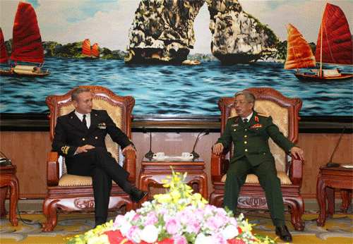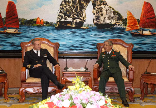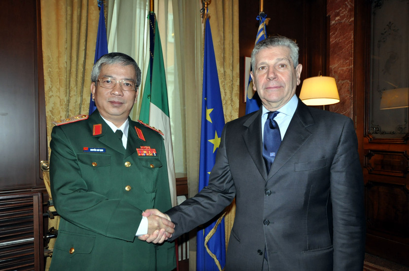 Thứ trưởng Quốc phòng Việt Nam Nguyễn Chí Vịnh tiếp Chuẩn Đô đốc Giô-giô La-zio - Cục trưởng Cục Chính sách quân sự thuộc Bộ Quốc phòng Italia