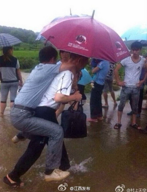 Ông này đang định đi qua chỗ ngập thì Ding, một nhân viên cấp dưới, đề nghị cõng ông qua.