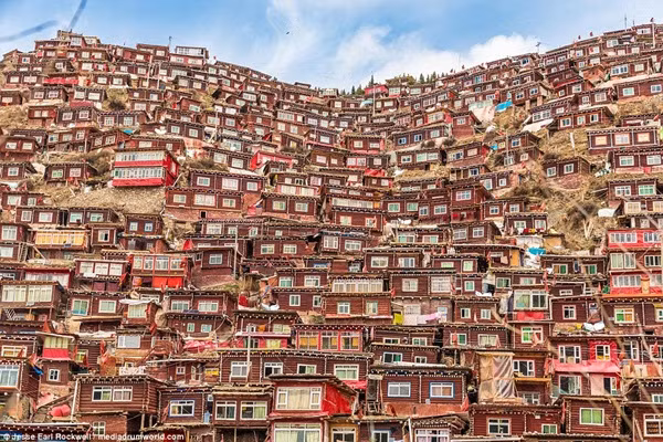 Hàng nghìn ngôi nhà gỗ san sát nhau, được sơn 2 màu chủ đạo nâu trầm và đỏ thẫm ở Larung Gar