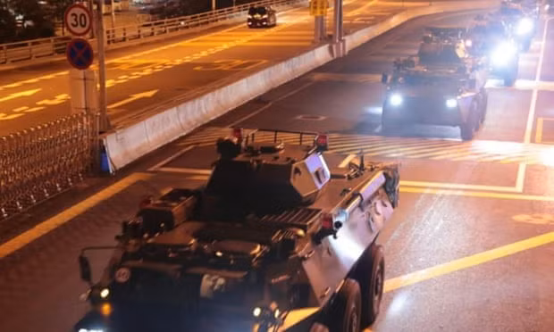 Xe bọc thép chở binh lính Trung Quốc chạy rầm rập trên đường phố Hồng Kông