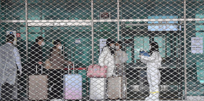 Sinh viên Trung Quốc được kiểm tra trước khi vào ký túc xá Đại học Dankook ở Yongin, tỉnh Gyeonggi hôm 23-2