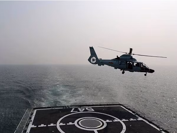 Một trực thăng cất cánh trên khinh hạm Linyi của Trung Quốc trong một cuộc diễn tập
