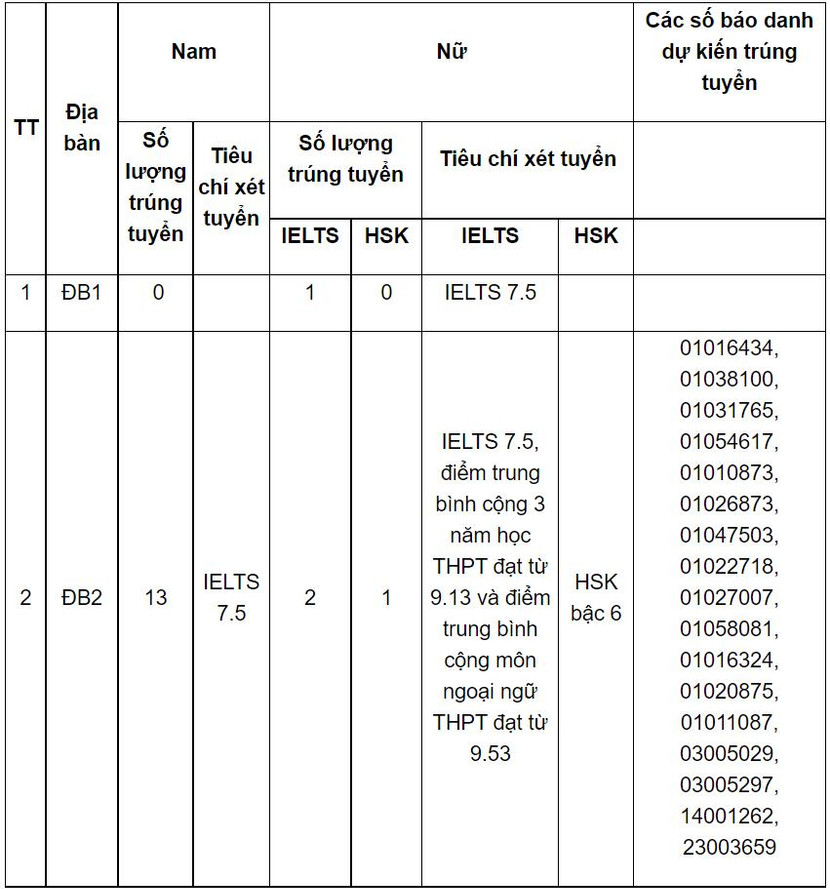 Theo đó, có 17 thí sinh trúng tuyển bằng phương thức này; trong đó, sử dụng chứng chỉ IELTS có 16 thí sinh trúng tuyển, gồm 13 nam và 3 nữ; chứng chỉ tiếng Trung Quốc HSK có 1 thí sinh trúng tuyển là nữ.