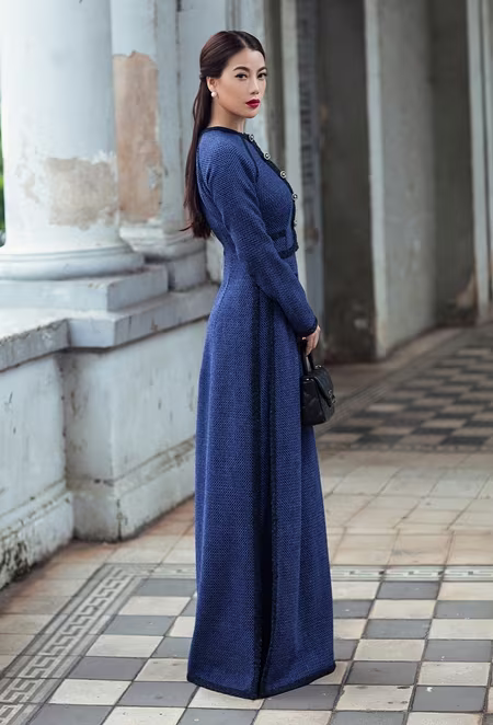 Chiếc áo dài của Nguyễn Công Trí có phần cổ áo và thân trên được cách điệu như chiếc áo khoác Chanel với đường diềm ở nắp túi, ve áo, cổ tay áo và hàng nút to bản đầy ấn tượng. Chất liệu vải tweed tưởng chừng nặng nề nhưng lại làm vững chắc thêm cấu trúc áo dài và làm cho phần tà thêm phẳng phiu trang nhã. Một số thiết kế kết hợp thêm áo khoác mang dáng dấp thiết kế kinh điển của Chanel, làm cho tổng thể thêm phần sang trọng, vừa lạ vừa quen.