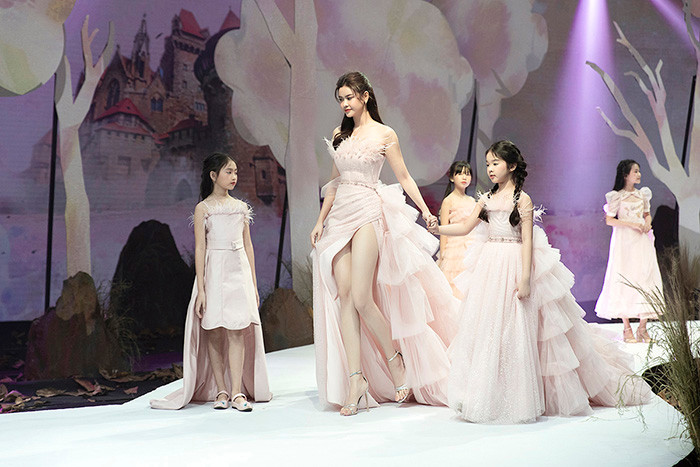 | Xuất hiện tại "Vietnam Junior Fashion Week", Trương Quỳnh Anh diện trang phục đầm dạ hội màu hồng pastel của nhà thiết kế Kim Chi |