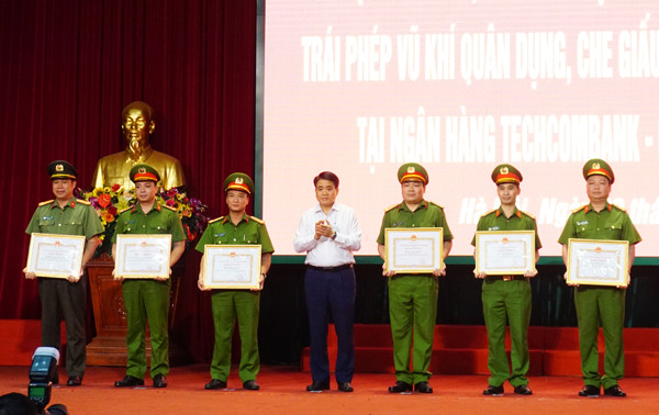 Thay mặt lãnh đạo Thành phố, Chủ tịch Nguyễn Đức Chung đã trao tặng quyết định khen thưởng cho các đơn vị tham gia khám phá thành công 3 chuyên án trong tháng 4 này, là vụ cướp tại chi nhánh ngân hàng ở huyện Sóc Sơn; vụ buôn bán, làm giả thiết bị y tế tại quận Đống Đa; và vụ bắt giữ đối tượng phạm tội về ma tuý tại xã Nguyên Khê, huyện Đông Anh, thu 1 khẩu súng.