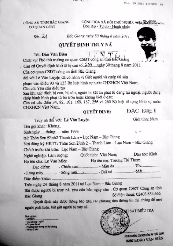 Ngày 30-8, Thượng tá Đào Văn Biên - Phó Thủ trưởng Cơ quan CSĐT Công an tỉnh Bắc Giang đã ký quyết định truy nã đặc biệt đối với nghi can số 1 của vụ án: Lê Văn Luyện (SN 1993), đăng ký HKTT tại xã Thanh Lâm, huyện Lục Nam, Bắc Giang. Lê Văn Luyện bị truy nã theo 2 tội danh giết người và cướp tài sản (Điều 93 và Điều 133 - Bộ luật Hình sự). Đối tượng này trốn khỏi nơi cư trú từ 24-8-2011, đúng vào hôm vụ án mạng nghiêm trọng tại hiệu vàng Ngọc Bích bị phát hiện. CQĐT công an tỉnh Bắc Giang yêu cầu quần chúng nhân dân, khi bắt giữ hoặc phát hiện nơi lẩn trốn của tên Luyện ở đâu, báo tin ngay cho cơ quan công an nơi gần nhất; hoặc báo về Cơ quan CSĐT Công an tỉnh Bắc Giang theo số điện thoại: 02403.854.666. |