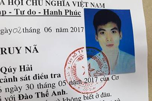 Cơ quan CSĐT cũng ra quyết định truy nã đối với Đào Thế Anh, kẻ xác định chủ mưu trong vụ án này, hiện đang trốn khỏi nơi cư trú. Đề nghị người dân, ai phát hiện hoặc biết thông tin về Đào Thế Anh, hãy bắt giữ, dẫn giải hoặc báo ngay cho cơ quan Công an gần nhất. Hoặc báo tin đến Đội Cảnh sát hình sự- CAQ Tây Hồ, Hà Nội. Địa chỉ 739 Lạc Long Quân, quận Tây Hồ. Điện thoại 0983647133.