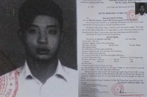 Công an TP Hải Phòng vừa thông tin về việc, Cơ quan CSĐT Công an quận Lê Chân (TP Hải Phòng), đã ra quyết định truy nã đối với bị can Hoàng Anh Mỹ (SN 1995, quê quán Khoái Châu, Hưng Yên, tạm trú tại quận Ngô Quyền, TP. Hải Phòng), về tội "Gây rối trật tự công cộng".