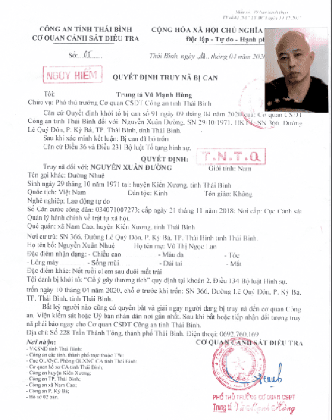 Chiều 10-4, Cơ quan CSĐT Công an tỉnh Thái Bình ra Quyết định truy nã đối với bị can Nguyễn Xuân Đường