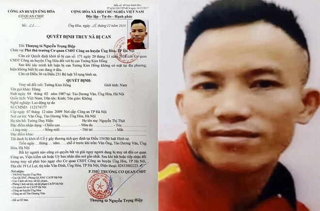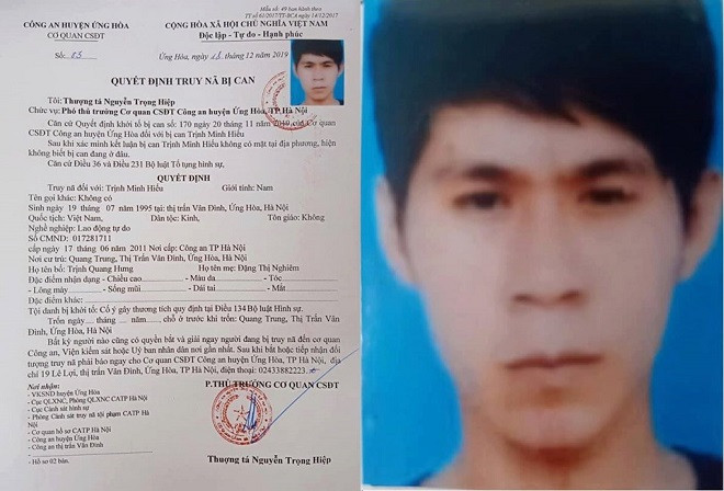 Ngày 18-12-2019, Cơ quan CSĐT Công an huyện Ứng Hòa đã ra quyết định truy nã bị can đối với Trịnh Minh Hiếu và Tưởng Kim Hồng.