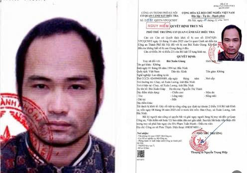 Ngày 20-11, CATP Hà Nội thông tin, Cơ quan CSĐT CATP đã ra quyết định truy nã Bùi Xuân Giang (SN: 1994; thường trú tại: xã Xuân Lương, tỉnh Bắc Ninh) về tội Gây rối trật tự công cộng.