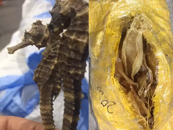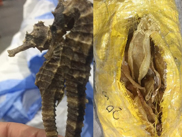 Qua kiểm tra phát hiện bên trong lô hàng có 18 bao tải, đựng bong bóng loài cá chưa xác định chủng loại và 5 bao tải đựng cá ngựa có tổng trọng lượng có 352kg.