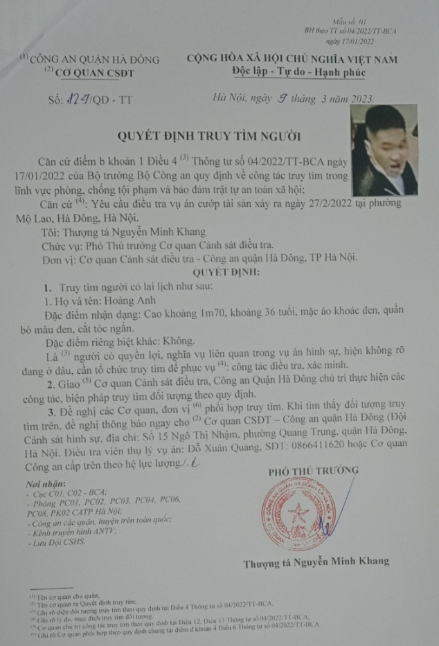 Quá trình xác minh, xác định người nam thanh niên tên Hoàng Anh, có liên quan đến vụ việc; nên ngày 9/3/2023, Cơ quan CSĐT- Công an quận Hà Đông đã ra quyết định truy tìm người số 124 đối với Hoàng Anh.