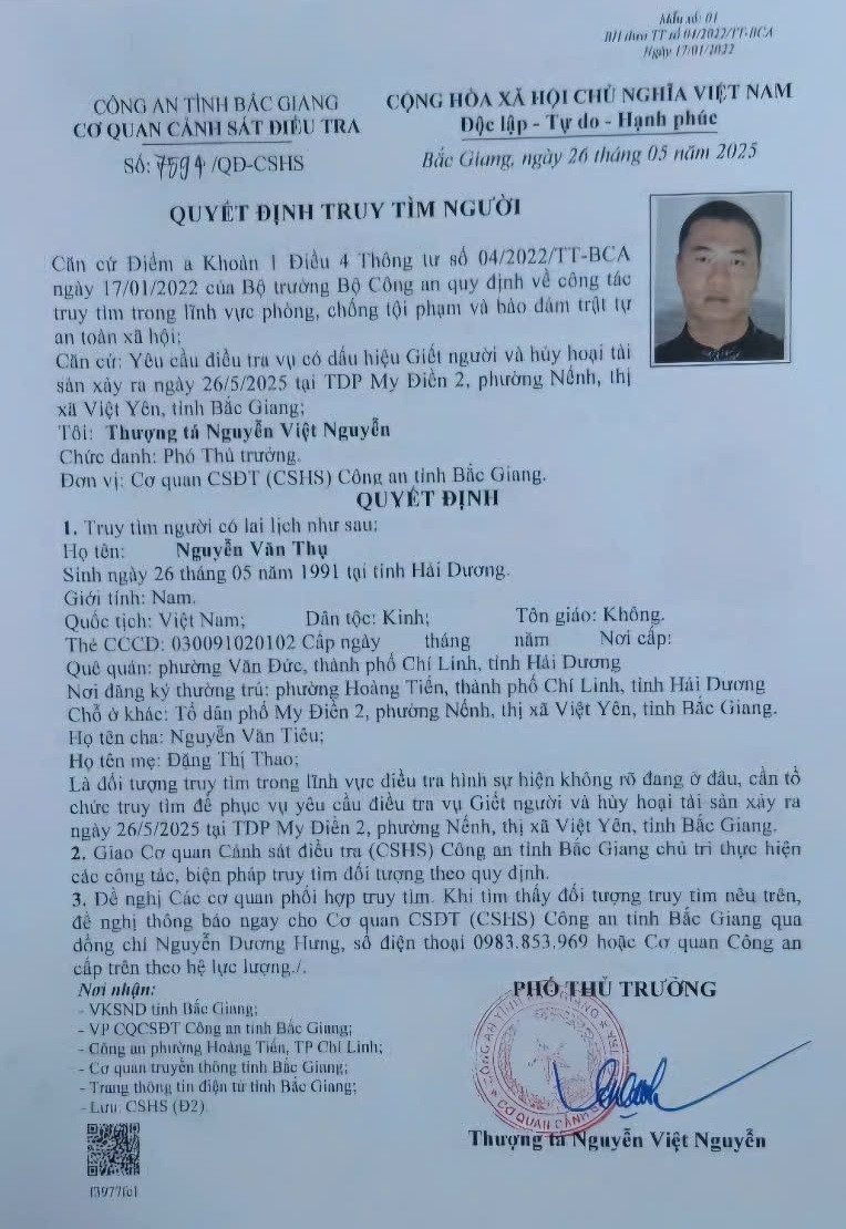 Lãnh đạo Công an tỉnh đã chỉ đạo các đơn vị nghiệp vụ tổ chức khám nghiệm hiện trường, tập trung lực lượng, áp dụng đồng bộ các biện pháp nghiệp vụ khẩn trương điều tra xác minh; đến 09h cùng ngày đã điều tra làm rõ, xác định đối tượng gây án là Nguyễn Văn Thụ, sinh năm 1991, hộ khẩu thường trú tại phường Hoàng Tiến, thành phố Chí Linh, tỉnh Hải Dương; tạm trú tại tổ dân phố My Điền 2, phường Nếnh, thị xã Việt Yên. Sau khi thực hiện hành vi phạm tội, đối tượng Nguyễn Văn Thụ đã bỏ trốn khỏi địa phương.