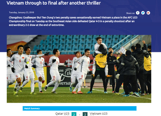Trang chủ Liên đoàn bóng đá châu Á (AFC) đăng nổi bật bài viết ca ngợi U23 Việt Nam với hàng tít: "Việt Nam vào chung kết sau trận đấu khủng khiếp!".