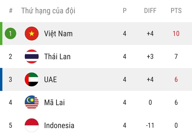 Xếp hạng bảng G vòng loại World Cup 2022 khu vực châu Á sau 4 vòng