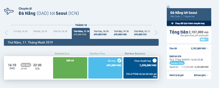 Lịch bay một chiều từ Đà Nẵng đi Seoul ngày 17/10 của Bamboo Airways - Ảnh chụp màn hình.