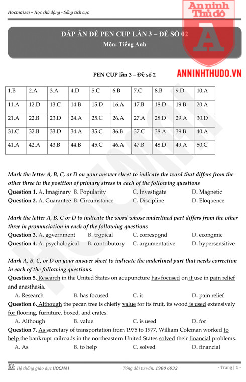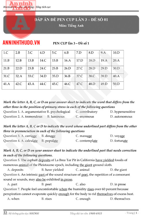 * ĐÁP ÁN MÔN TIẾNG ANH: