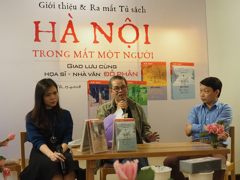 “Tủ sách Hà Nội trong mắt một người” mở đầu với 4 cuốn sách của họa sĩ – nhà văn Đỗ Phấn: “Bâng quơ một thời Hà Nội”, “Đi chơi Bờ Hồ”, “Ngẫm ngợi phố phường”, “Ngồi lê đôi mách với Hà Nội”.