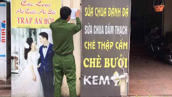 Tổ công tác CAH Mê Linh tuyên truyền giúp người dân dán thông báo tạm dừng hoạt động kinh doanh phòng chống dịch bệnh Covid-19 lan rộng