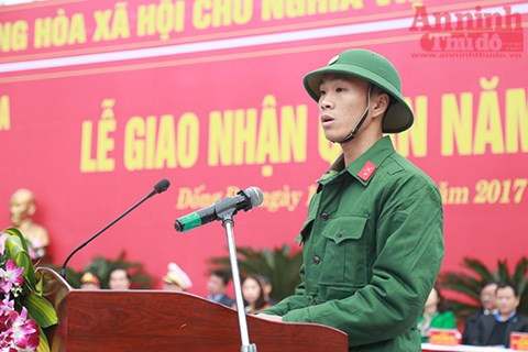 Thay mặt cho các tân binh lên đường nhập ngũ, tân binh Nguyễn Ngọc Tâm (Đống Đa, Hà Nội) xin hứa noi gương các thế hệ anh bộ đội Cụ Hồ, không ngừng học tập, phấn đấu, rèn luyện, chiến đấu, hoàn thành xuất sắc mọi nhiệm vụ được giao (Ảnh: Lam Thanh)
