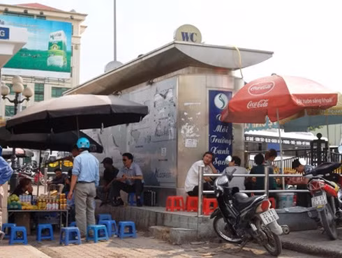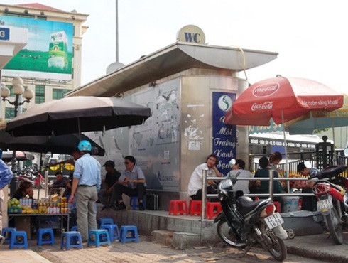 Nhà vệ sinh công cộng bị quây bởi đủ các hàng quán ăn uống