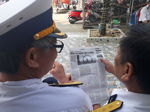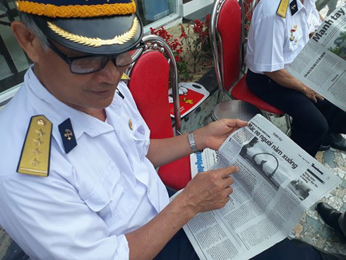 Đại úy Hoàng Văn Đồng và đồng đội cùng xem bài viết về sự kiện 29 Gạc Ma trên báo Tiền Phong số ra ngày 14/3/2017. Đại úy Đồng nguyên là Tiểu đoàn phó chính trị, sự kiện Gạc Ma ngày 14/3/1988, ông Đồng đang làm đội trưởng đội xây dựng nhà chòi, cắm cờ chủ quyền trên đảo Núi Le cách Gạc Ma không xa.