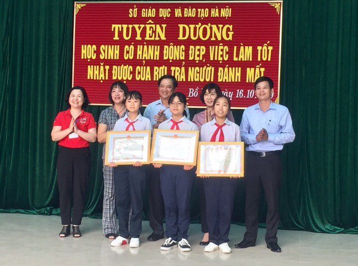 Trước đó, ngày 16/10, lãnh đạo Sở GD-ĐT Hà Nội cũng đã tặng giấy khen, biểu dương hành động đẹp nhặt được của rơi trả lại người đánh mất của ba em Tăng Vũ Hà Linh, Nguyễn Bảo Ngọc và Hà Ngọc Ánh, học sinh lớp 8A1, Trường THCS Bồ Đề, quận Long Biên.