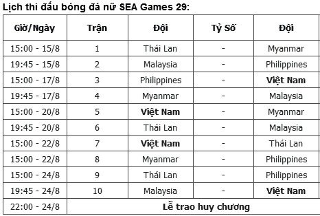 Môn bóng đá nữ SEA Games 29 sẽ diễn ra từ ngày 15-8 đến 24-8 tại 3 địa điểm gồm sân Shah Alam, SVĐ UM Arena và SVĐ UiTM Shah Alam. 5 đội thi đấu vòng tròn 1 lượt để tính điểm xếp hạng.