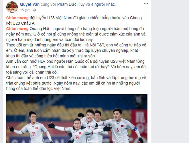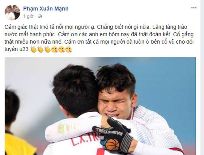 ANTD.VN - Các tuyển thủ đều chia sẻ cảm xúc vỡ òa sung sướng và niềm tự hào khoác lên mình chiếc áo đội tuyển U23 Việt Nam sau chiến thắng trước Qatar ở bán kết, gây chấn động giải châu Á. Từ quê nhà, đồng đội, đàn anh của họ cũng gửi những lời chúc đầy tự hào.