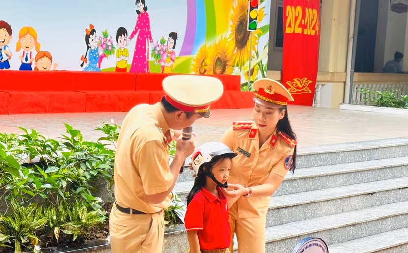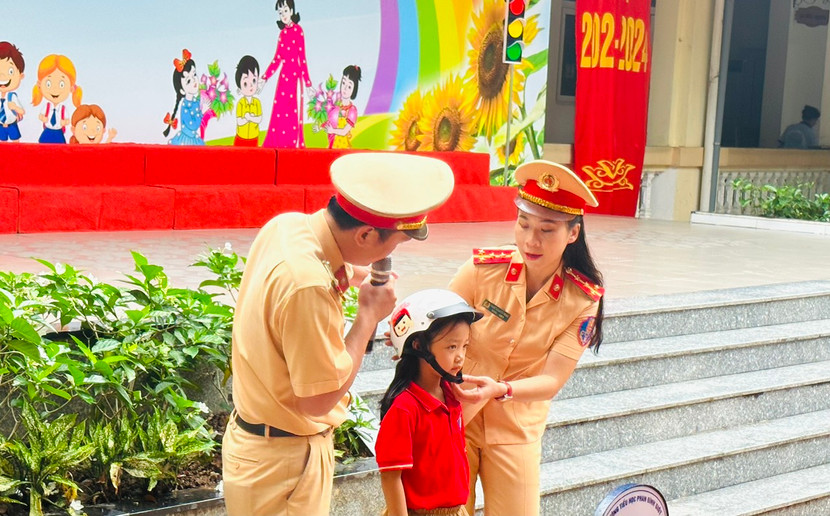 | Hướng dẫn các em học sinh cách đội mũ bảo hiểm đúng quy định |