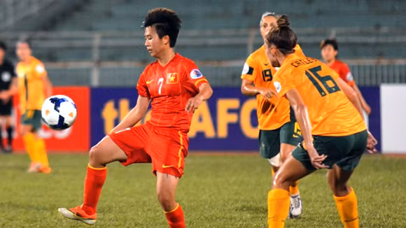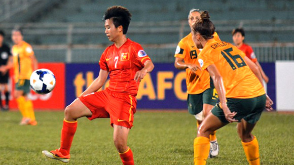 Phút 42, sau một pha hỗn loạn trước khung thành chủ nhà, trọng tài cho rằng thủ môn Tuyết Mai đã bắt bóng từ đường chuyền về của đồng đội và cho Australia hưởng quá phạt gián tiếp. Emily Van Egmond tung cú dứt điểm cực mạnh từ cự li 10m, thủ môn Tuyết Mai xuất sắc ngã người cản phá. Nhưng thật không may cho Việt Nam pha phá bóng lên sau đó của Nguyễn Thị Hoà lại trúng chân đồng đội bay thẳng về lưới nhà, "biếu" cho đội khách bàn mở tỉ số.