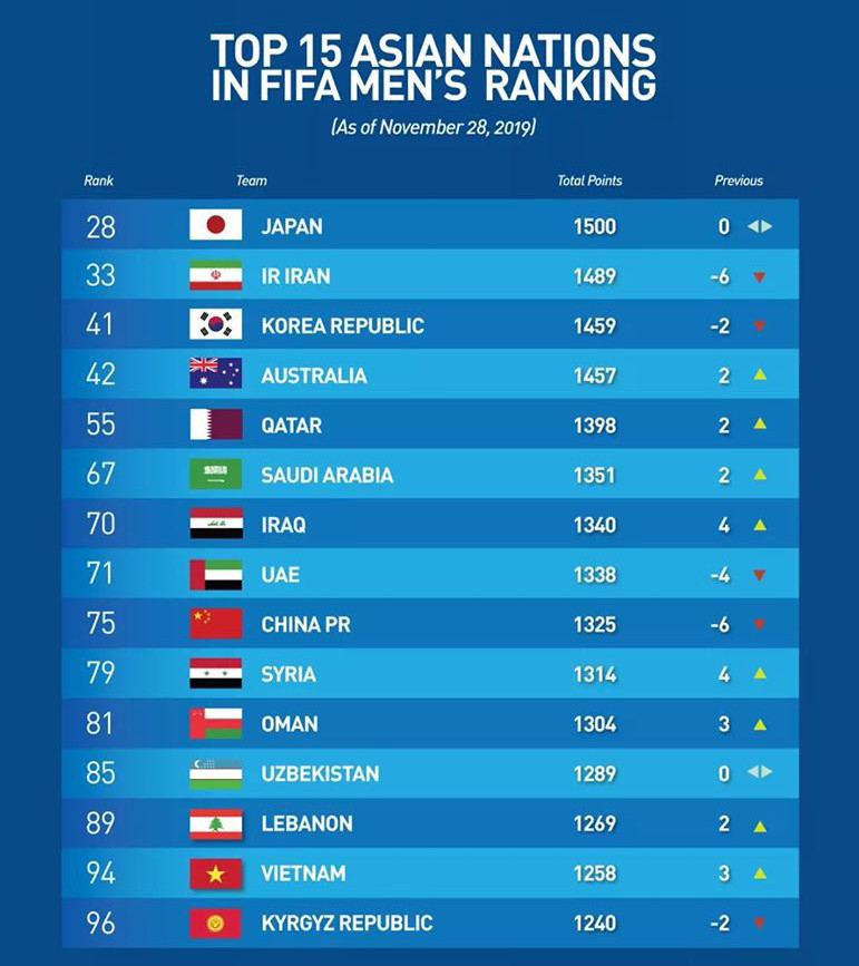 Cũng theo bảng xếp hạng FIFA tháng 11-2019, Bỉ, Pháp, Brazil tiếp tục chia nhau 3 vị trí cao nhất của thế giới, trong khi ở khu vực châu Á, top 3 thuộc về Nhật Bản, Iran và Hàn Quốc.