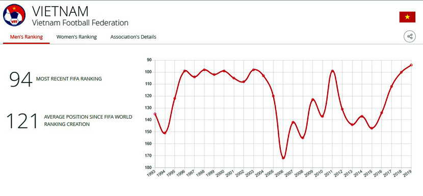 Năm 2017, khi lần đầu tiên ký hợp đồng với Liên đoàn bóng đá Việt Nam, HLV Park Hang-seo cam kết đưa ĐT Việt Nam lọt top 100. Song ông thầy Hàn Quốc chỉ cần hơn 1 năm để hiện thực hóa cam kết, đồng thời xác lập cột mốc thứ hạng 94, chỉ chưa đầy một tháng sau khi tái ký hợp đồng.