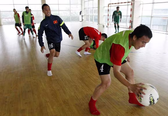 Do không được đi giày đinh trên sàn thi đấu futsal, các tuyển thủ buộc phải đi tất chơi bóng