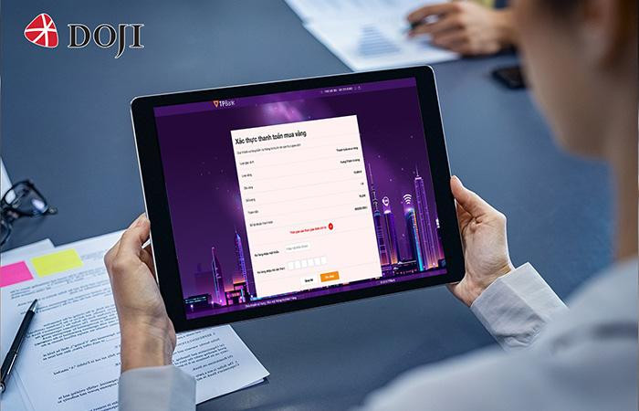Sau khi lựa chọn số lượng vàng, hệ thống tự động chuyển lại giao diện thông báo xác thực mua vàng. Khách hàng sẽ nhận một mã OTP do TPBank gửi đến số điện thoại đăng ký hoặc lấy mã etoken trên app TPBank mobile để xác minh giao dịch. Khách nhập mã OTP hoặc mã etoken và nhấn “Xác nhận”. Khi bán vàng, khách hàng chọn loại vàng và số lượng vàng đã có trong TK eGold. Sau đó khách hàng sẽ nhận một mã OTP do DOJI gửi đến số điện thoại đã đăng ký để xác minh giao dịch. Nhập mã OTP và nhấn ‘Xác nhận”.