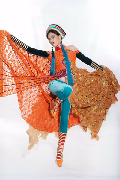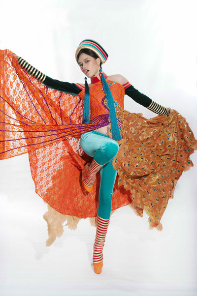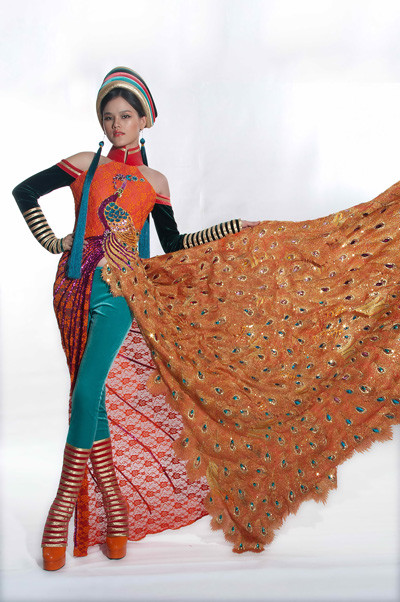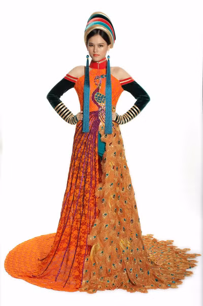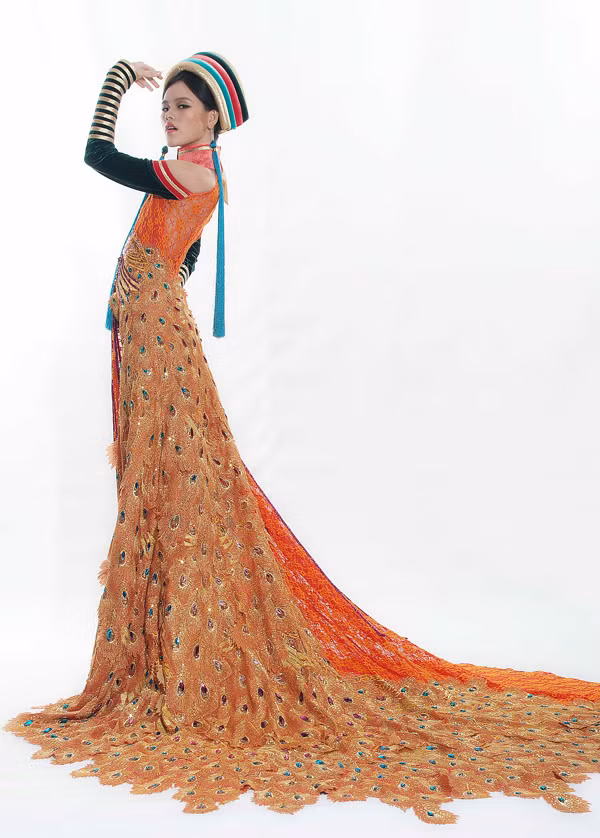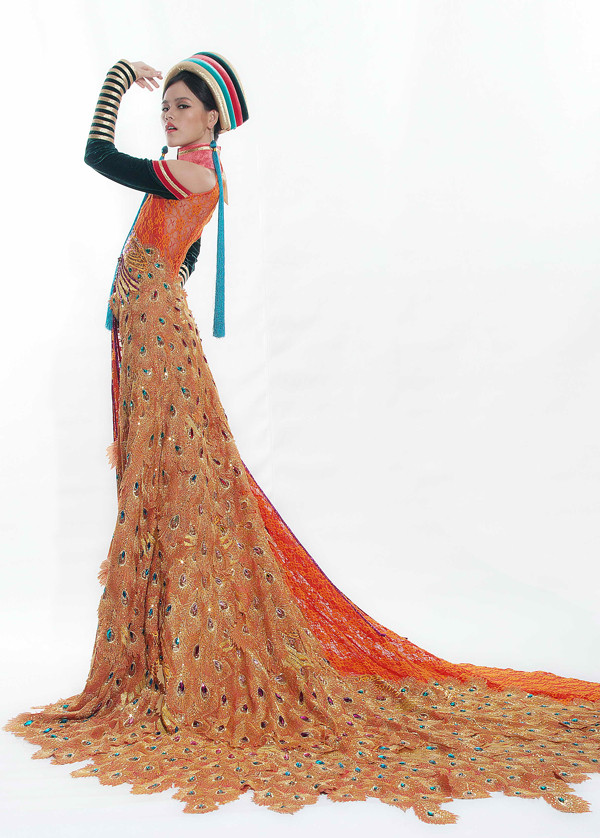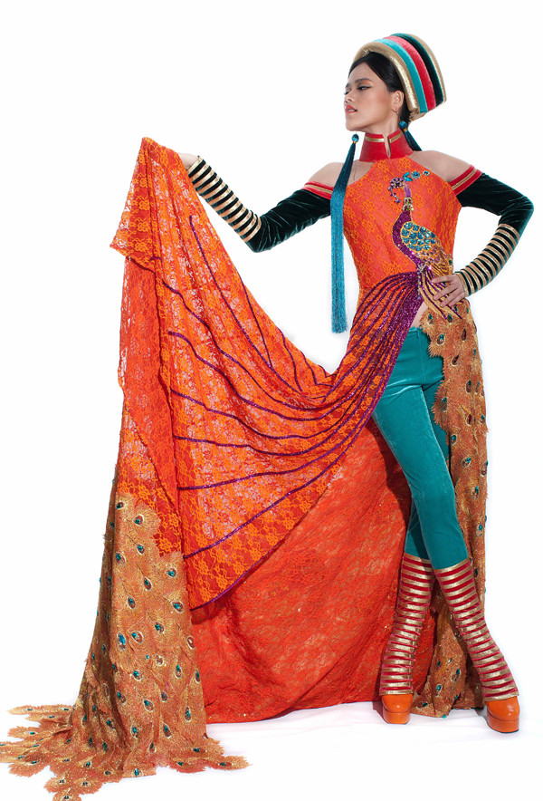 Chiếc áo do NTK Võ Việt Chung làm từ chất liệu ren kết hợp nhung với màu sắc rực rỡ chủ đạo như cam, xanh cổ vịt, nhũ vàng… và lấy biểu tượng con chim trĩ, một loài chim mạnh mẽ và thông minh được sử dụng để trang trí trong nhà hay những lễ hội truyền thống của dân tộc Dao để tạo dáng và thêu từng chiếc lông chim trĩ hay kết hợp cùng các loại đá quý lên thân áo và đuôi áo tạo nên một bức tranh văn hoá rực rỡ đa sắc màu của bản làng dân tộc Dao.