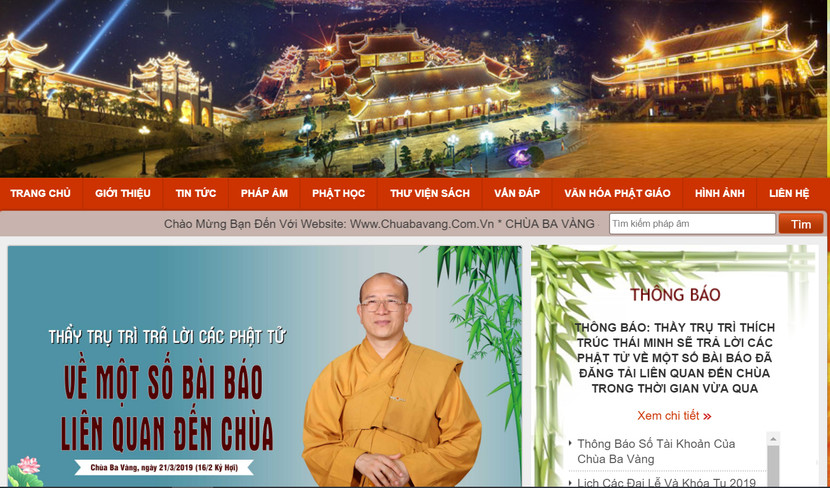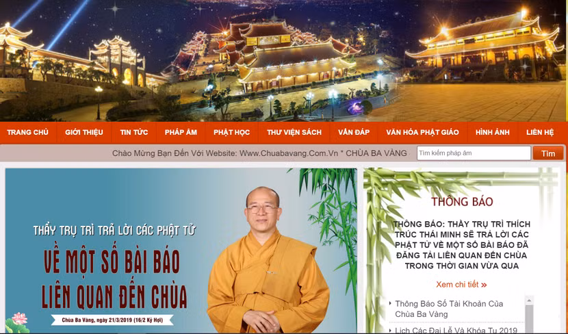 Ảnh chụp màn hình trang chủ website Chùa Ba Vàng