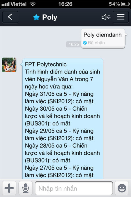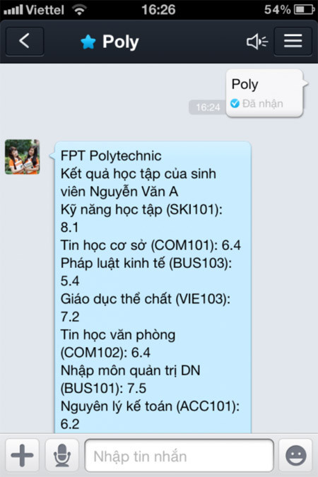 Ví dụ, khi soạn tin POLY hoặc POLY_KETQUA, phụ huynh sẽ nhận được thông tin kết quả học tập của con em mình được tích lũy kể từ khi nhập học đến thời điểm nhắn tin. Đối với các môn đã hoàn thành, hệ thống sẽ trả về điểm của các môn này và ngược lại nếu môn học chưa kết thúc sẽ trả về tỉ lệ có mặt của sinh viên trên tổng số các buổi đã học của môn đó.