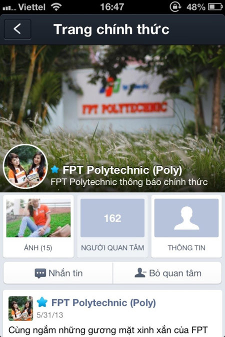Là ứng dụng nhắn tin trên di động miễn phí, mọi lúc mọi nơi, tốc độ truy cập nhanh, Zalo đang trở thành ứng dụng được ưa chuộng nhất tại Việt Nam. Việc Cao đẳng thực hành FPT Polytechnic quyết định sử dụng Zalo làm phương tiện hỗ trợ việc học tập là bước phát triển mới giữa giáo dục và công nghệ nhắn tin miễn phí, nhằm phục vụ tối đa cho sinh viên và sự phát triển của ngành giáo dục.